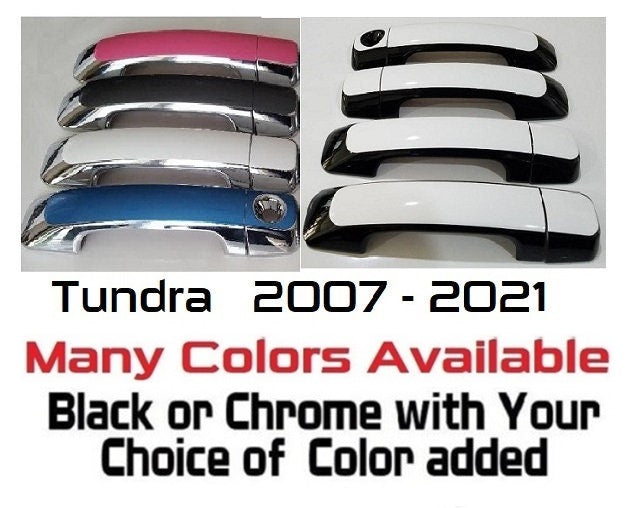 One Complete Set of Two-Tone Chrome or Gloss Black and Color-Matched Door Handle Overlays for the 2007 - 2021 Toyota Tundra. These are High-Quality Triple Plated Chrome or Gloss Black, High-Quality Automotive Vinyl Wrap, as well as 3M self-adhesive tape to adhere these over top of your existing handles. We DO NOT use any cheap automotive vinyl and all Vinyl comes with a gloss protective laminate and a 7-year guarantee. The colored vinyl is cut from templates and are custom cut to be an exact fit for 2007 - 2021 Toyota Tundra. These custom door handles are "peel and stick" overlays/covers that adhere over top of your existing door handles so installation is VERY simple and requires no tools, etc